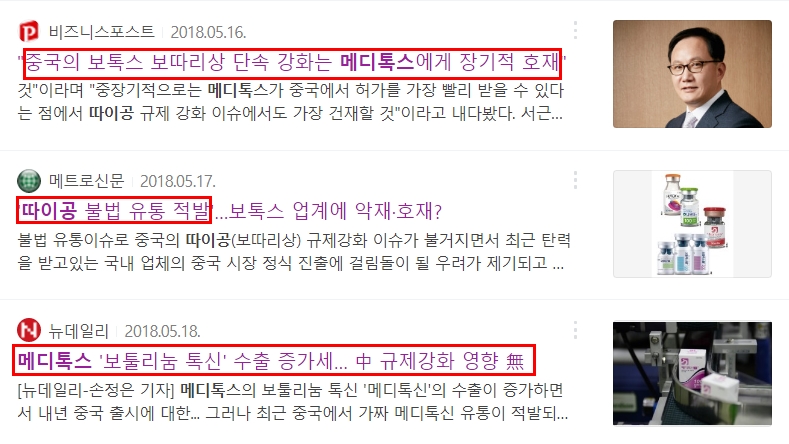 이 상황으로 미뤄 봤을 때, 메디톡스는 따이공으로 인해 수혜를 받은 기업이라고 생각할 수도 있을 것 같습니다. 사실 따이공을 통한 매출 증가는 강력한 기술 경쟁력을 바탕으로 한 것이 아닌, 따지고 보면 편법을 이용한 방법이라고 볼 수 있습니다. (지나고 나서야 보이는 거라는 것엔 반박의 여지가 없습니다.)