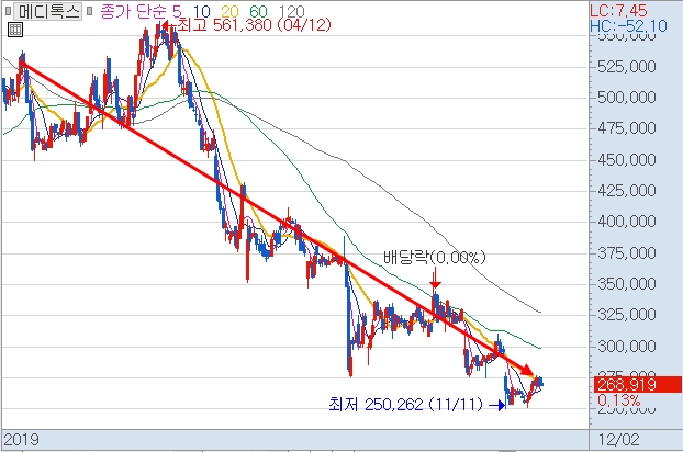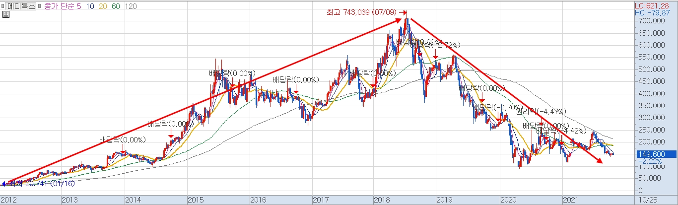 과거에 엄청난 성장주였지만 지금은 아무도 쳐다보지 않는 <메디톡스>라는 종목을 예로 들어보겠습니다.