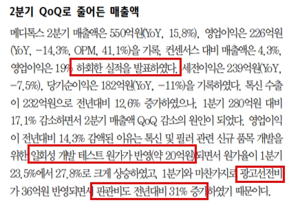 하락한 이유는 너무 큰 기대감이었던 것 같습니다. 컨센서스 대비 영업이익이 19% 하회했었다고 하네요. 어닝 쇼크 이유는 ① 톡신 수출액 전년대비 28.7% 감소 ② 일회성 요인(테스트 원가) ③ 광고선전비로 인한 판관비 증가라고 했습니다.