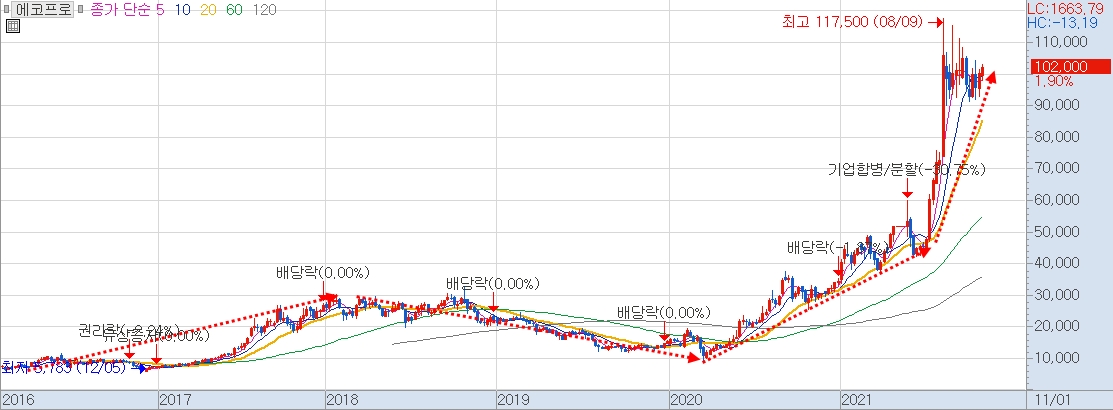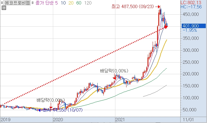 그 후에 에코프로는 에코프로비엠의 지분을 50% 갖고 있음에도 2차 전지 테마를 타고 폭등한 것을 볼 수 있습니다. 에코프로비엠은 물적 분할 3년 후인 2019년 3월 5일에 상장했는데 당시 주가는 6만 원이고 지금 주가는 40만 원입니다.