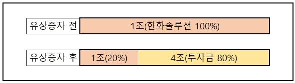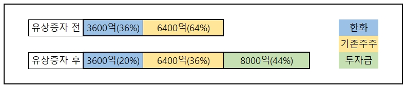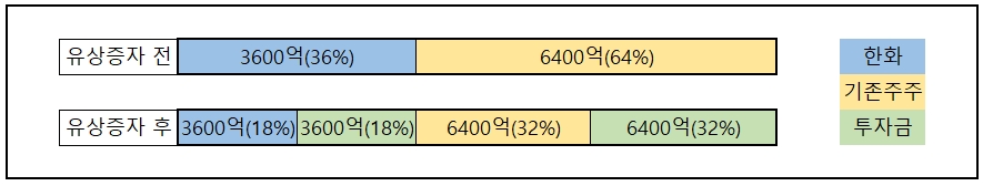 하지만 여기서 문제는 한화도 유상증자에 참여해야 한다는 겁니다. 1조 원의 자금을 조달받으면서 지배 구조를 유지하기 위해서는 한화도 본인의 지분율만큼 3600억 원을 내야 하는 거죠. 실제로 외부에서 받는 투자금은 6400억 원 밖에 되지 않고요.