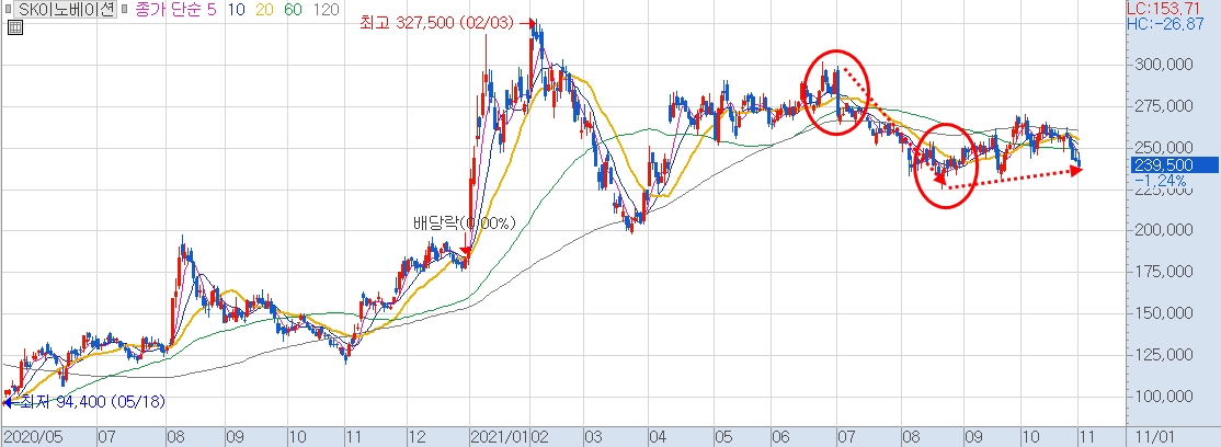 SK이노베이션은 20년 7월 1일, 배터리와 E&P 사업에 대한 물적 분할 고려 소식에 9%가 하락합니다. 그 이후로도 하락세를 타다가 20년 8월 3일 물적 분할이 확정 나자 장중 8%가 폭락했습니다.