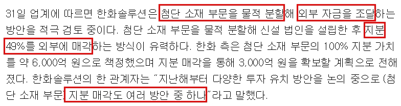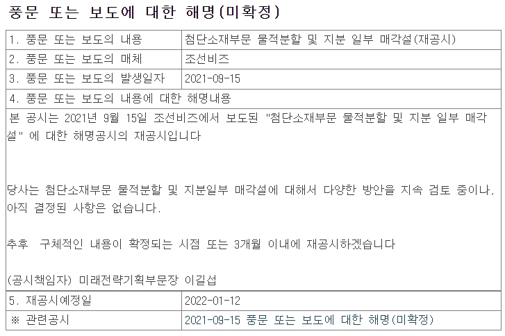 물론 첨단부문 소재의 물적분할에 대한 소식이 이번뿐만이 아니었습니다. 지난해부터 매각설이 끊이지 않자, 한화솔루션에서 21년 10월 13일에 "확정된 바가 없다"라고 공시를 올린 적이 있거든요.
