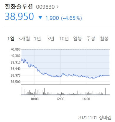 그래도 아직 정해지지 않았을 뿐이지 언제든 물적 분할에 대한 가능성이 있다 보니 한화솔루션의 주가는 약 5% 하락 마감합니다. 관련 소문에 대한 공시가 아직 없는 걸 보니... 물적 분할 가능성이 높긴 하나 봅니다.