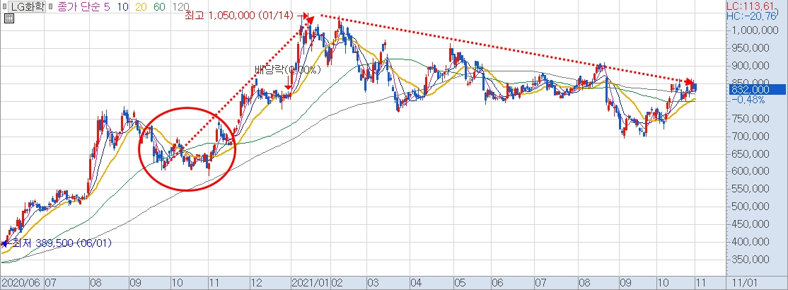 LG화학은 20년 9월 16일, 배터리 사업 부문에 대한 물적 분할 발표 후에 15% 이상 하락했다가 단기 고점을 찍고 다시 하락한 것을 볼 수 있습니다. 그래도 물적 분할 발표 전 주가보다는 10% 이상 상승한 것을 확인할 수 있네요.