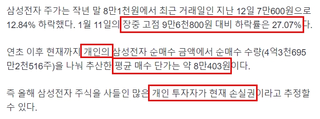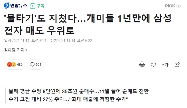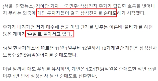 대한민국 대표 우량주인 삼성전자가 개인 투자자 기준, 11월 달 현재 매도가 더 많다는 뉴스입니다.