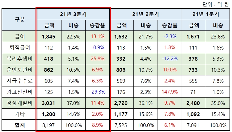 판관비 중에서 크게 증가한 부분은 급여, 복리후생비, 운반 보관비, 경상개발비 정도로 볼 수 있습니다. 코로나 상황을 감안하면 문제가 있는 수준의 증감은 없어 보입니다. 그중 개발비가 꾸준히 증가하고 있는 건 좋은 것 같네요.