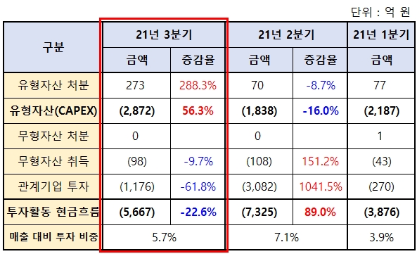 가치주에서 성장주로 변하는 현대모비스 특성상 투자활동 현금흐름이 중요할 것 같아 이 부분만 가져와봤습니다.