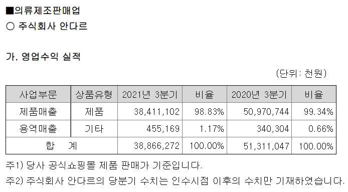 안다르의 21년 1~3분기의 사업별 누적 매출 현황을 확인할 수 있습니다.