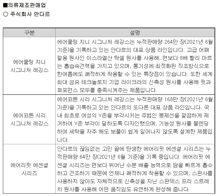 안다르의 21년 1~3분기의 사업별 누적 매출 현황을 확인할 수 있습니다.