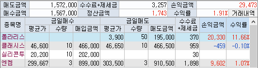 그래도 그중에 몇몇 조건이 맞는 주식만 매수하려 했고 아주 소량의 이익 봄.