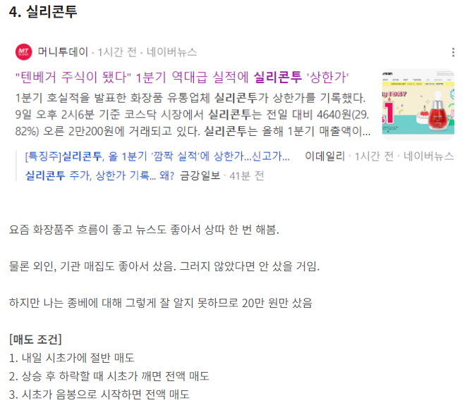 어제 매도 조건에 시초가 깨면 전액 매도로 써놓고 조금 성급했던 것 같음.