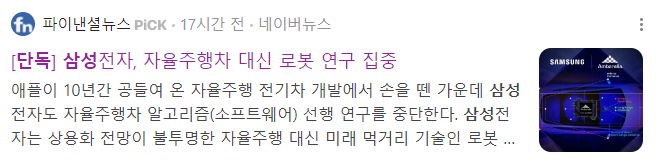 어제 뉴스에 삼성전자가 자율주행차 포기하고 로봇 연구에 집중한다는 소식에
