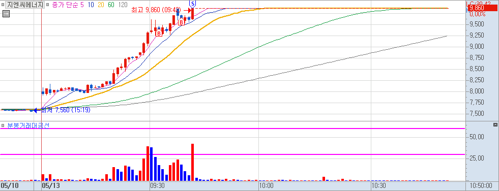 이후 프로그램 매수 들어오는 종목 중에 실시간 인기 있는 종목 찾아봤는데 지엔씨에너지가 보임.