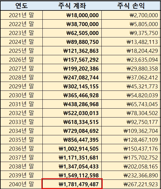 (실제로 배당금 2천 만원 초과 시 종합소득세로 과세가 되는데 미래에는 물가 상승률에 맞게 기준이 바뀔 것이라 생각해서 15.4%로 계산함, 만약 기준이 올라가지 않으면 24%의 과세가 되므로 더 많은 돈이 필요할 수 있음)