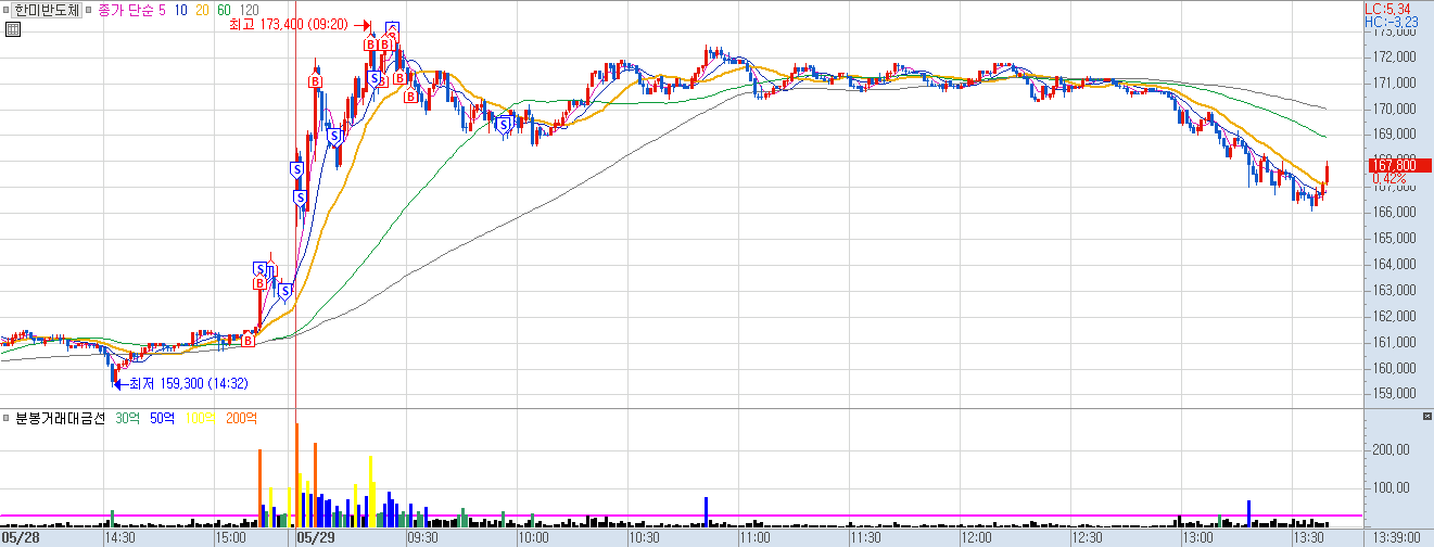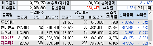 사실 반도체 주가 다 강력했으면 나쁘지 않은 매매라고 생각하는데 반도체 주가 생각보다 지지부진한 상황에서의 매매는 자제했어야 했다고 봄.