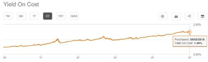 QQQ는 사실 배당을 보고 투자하는 ETF는 아닙니다. 기술주 특성상 성장에 대한 투자가 중요하므로 배당을 주기보다 그 돈으로 R&D에 많이 투자하기 때문이죠. 대신 높은 시세 차익을 기대할 수 있는 겁니다. 그래도 나름 주가 상승과 더불어 배당금도 증가하고 있네요. 만약 10년 전에 QQQ에 투자했다면 지금은 1.49%의 배당율로 배당금을 받을 수 있습니다.