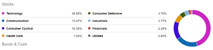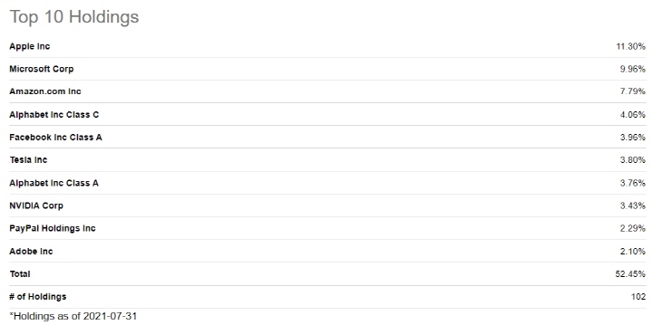 보유 종목 중 TOP 10개의 기업을 보면 애플, 마이크로소프트, 아마존, 페이스북, 테슬라, 알파뱃(구글), 엔비디아, 페이팔, 어도비 등 미국의 대표적인 기술주로 구성되어 있고 10개 기업이 비중의 약 50%를 차지하고 있으며 나머지 90개의 기업이 나머지 50%를 차지합니다.