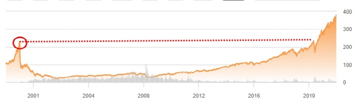 QQQ는 1998년 IT 버블 당시 고점에서 물렸다면 약 20년 후에나 회복이 가능했습니다. (코스닥은 아직도 회복 못했고요.) 물론 저기 꼭짓점에서 몰빵을 하지 않는 이상 적립식 분할 매수 원칙만 지켰다면 지금은 원금 회복을 하고도 수익을 볼 수 있겠지만 단지 최근 주가 상승률만 비교해서 "QQQ가 무조건 좋네?"라는 착각을 해선 안 된다는 뜻입니다.