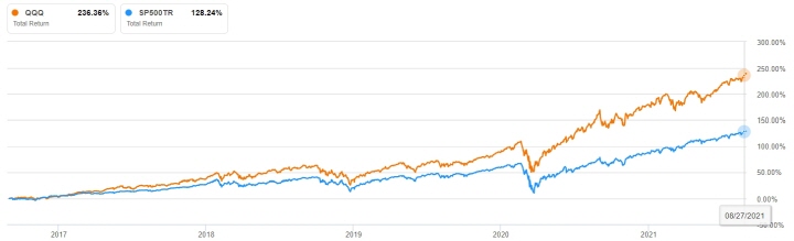 미국의 대표 ETF인 QQQ와 SPY의 5년 동안 주가 흐름 비교입니다. 배당금을 모두 재투자한다는 가정 하에 QQQ는 236%, SPY는 128%의 수익율을 보였습니다. SPY와 비교해서 수익률이 약 2배가 차이가 나서 차라리 QQQ를 모아가는 것이 좋지 않나 싶어 보이지만 특정 섹터의 비중이 높은 QQQ는 모든 섹터에 골고루 투자하는 SPY보다 많은 변동성과 버블 위험이 존재합니다.