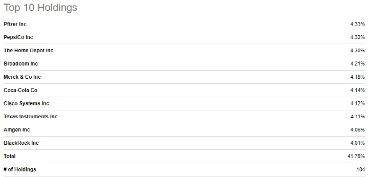 보유 종목 중 TOP 10개의 기업을 보면 화이자, 펩시, 홈디포, 브로드컴, 머크, 코카콜라, 시스코, T.I, 암젠, 블랙록 등으로 우리에게 익숙한 종목으로 구성되어 있습니다. 10개의 기업이 비중의 약 42%를 차지하고 있으며 나머지 94개의 기업이 약 58%를 차지합니다.