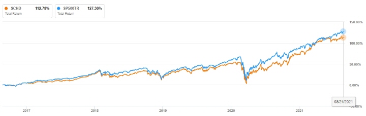 미국의 가장 대표적인 ETF인 SPY와 5년간 주가를 비교해보면 배당금을 모두 재투자 했다는 가정 하에 SPY는 127%, SCHD는 112%로 SPY가 조금 더 높습니다. 단 배당율은 SPY : 1.25%, SCHD : 2.81%로 2배 이상의 차이를 보입니다. 매 분기마다 현금 흐름이 SPY에 비해 SCHD가 2배 이상 들어온다는 점에서 조금 낮은 수익률은 별 문제 없어 보입니다.