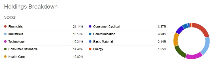 SCHD의 섹터 비중은 순서대로 금융이 21%로 가장 높고 그 다음은 산업재(18%), 기술주(16%), 경기방어주(14%), 헬스케어(12%), 경기민감주(8%), 통신주(5%), 원자재(2%), 에너지(2%)로 구성되어 있는 것을 확인할 수 있습니다. 포트폴리오가 굉장히 안정적으로 구성됐다고 생각합니다.