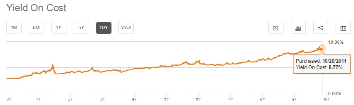 SCHD는 10년 동안 주가도 꾸준히 상승했지만 배당금도 증가시켰습니다. 만약 10년 전에 SCHD에 투자를 했다면 지금은 투자금 대비 8.77%의 배당 수익율을 받을 수 있다는 뜻입니다. 주가 상승은 덤이고요.
