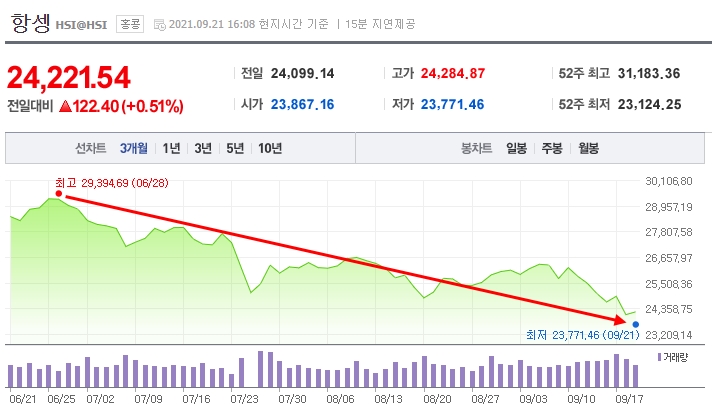 시장은 불확실성을 매우 싫어하기 때문에 최근 세계 주식 시장의 흐름이 좋지 않은 상황입니다. 안 그래도 테이퍼링이니, 금리인상이니 시장에 유동성 공급을 줄이려는 움직임이 보이는 상황에서 중국 기업의 파산설까지 돌고 있으니 시장이 좋아할 리가 없죠.