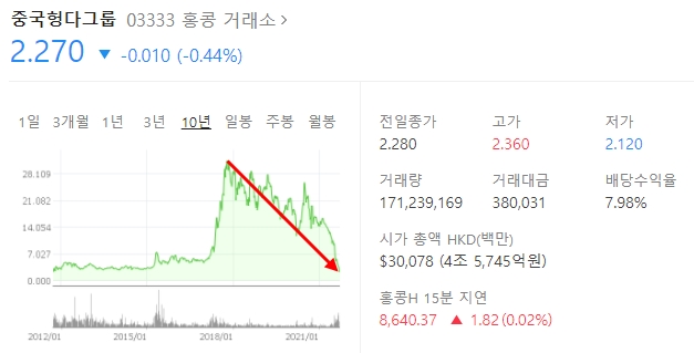 사실 헝다그룹의 파산 위기가 갑자기 찾아온 것은 아닙니다. 이미 몇 년 전부터 헝다그룹에 많은 문제가 있다는 것을 알고 있었고 그 여파로 주가는 무려 고점 대비 90% 이상 하락한 상황입니다.