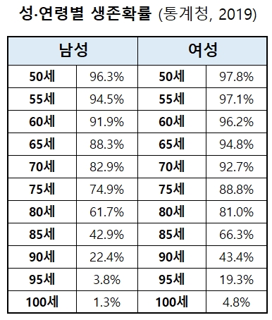 위 표는 통계청에서 2019년 발표한 생명표라는 파일에서 발표한 수치를 제가 정리한 겁니다. 0세 기준으로 50살까지 생존할 확률은 남녀가 96%가 넘고, 70살까지 생존할 확률은 80% 이상입니다. 현재 30세라면 이 생존 확률은 더 높을 것이고 앞으로는 얼마나 더 증가할지 모릅니다.