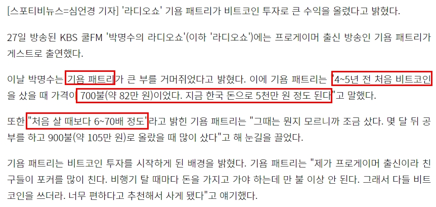 프로게이머 겸 방송인, 기욤 패트리가 4~5년 전에 비트코인에 투자해서 60배가 넘는 수익을 봤다는 기사가 화제더라고요.
