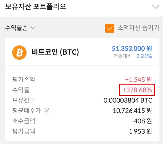위 사진에서 알 수 있는 사실은, 수익률도 물론 중요하지만 그보다 더 중요한 것은 '투자금'입니다. 제가 남겨놓은 400원이 +378%가 된 것이 뭐가 중요하나요? 고작 400원밖에 투자하지 않았는데요...