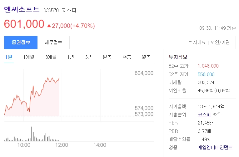 리니지W 2차 쇼케이스가 발표함과 동시에 엔씨소프트의 주가가 폭등하고 있습니다.