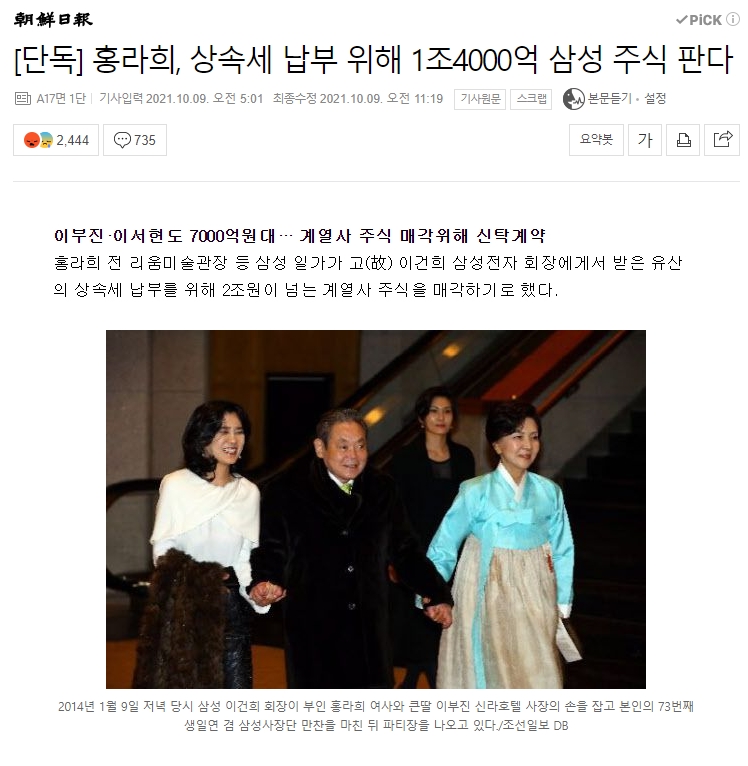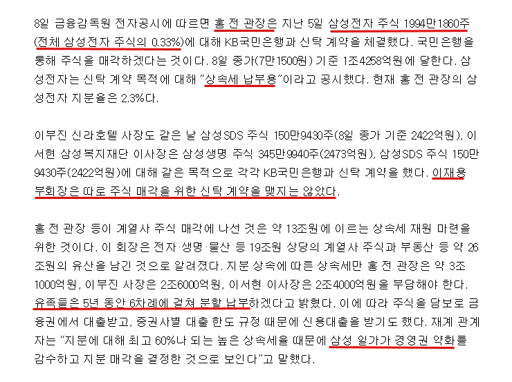 지배 구조가 흔들려서 삼성 일가의 경영권에 문제가 생길 수도 있다는 것은... 저는 솔직히 모르겠습니다. 저보다 똑똑한 초 엘리트들이 한 곳에 모여서 故 이건희 회장 별세 전에 이미 관련 시나리오는 다 만들어 놓지 않았을까요? 상식적으로 말입니다.