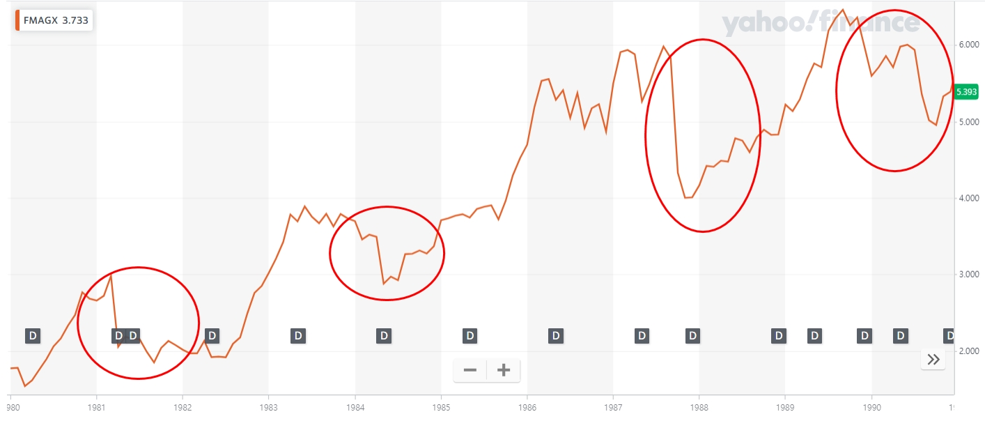 1980년 ~ 1990년까지 마젤란 펀드의 차트입니다. 사람들은 펀드 수익률이 높을 때 들어가서, 폭락할 때 팔고 나왔다고 합니다. 그냥 가만히 갖고 있었어도 수익이었을 텐데 말입니다.