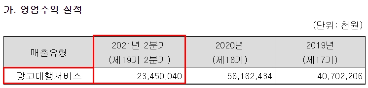 에코마케팅의 21년도 전반기 재무제표 현황입니다. 21년도 전반기의 전체 매출은 1,060억 원인데 종속기업의 매출은 약 860억 원, 즉 81%를 차지하므로 종속기업의 매출 구조도 매우 중요하겠죠. 전체 매출의 19%(약 230억 원)는 디지털 광고 및 종합대행 서비스에서 나옵니다. (30억 원은 내부거래로 인한 차감)