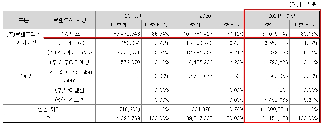 그에 비해 21년도 전반기 기준, 브랜드엑스의 매출 비중은 젝시믹스(레깅스)가 80%로 압도적인 비중을 차지하고 있고 그 이외의 사업이 20%를 차지하고 있음을 알 수 있습니다. 물론 기업을 인수하면서 새로운 매출 구조를 만들고 있으나, 아직까지는 브랜드엑스는 사실상 애슬레저(레깅스 등) 판매 기업이라고 해도 과언이 아니겠죠.