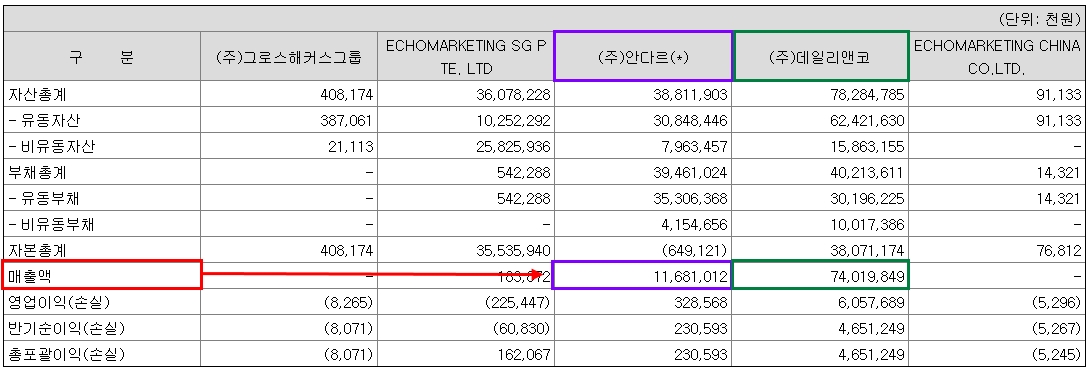 여기서 참고해야 하는 상황이 있는데 바로 안다르는 6월 달에 에코마케팅의 종속기업에 포함되어 6월 한 달 기준 매출액이 표시됐다는 겁니다. 즉 6월 한 달 기준 매출액이 약 120억 원입니다. 최대한 보수적으로 계산해서 안다르의 반기 매출을 약 400억 원이라고 가정해 보겠습니다.