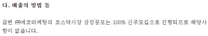 그에 비해 에코마케팅은 구주매출이 없었습니다. 기존 주주들은 주식을 처분하지 않았다는 뜻이죠. 공모 시 투자금은 모두 회사로 들어왔다고 생각하시면 됩니다.