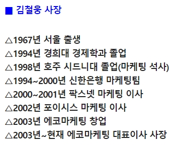 김철웅 대표의 경력은 네이버에 표시되지 않았네요. 경희대 경제학과에, 호주 시드니대 마케팅 석사에, 신한은행 마케팅 팀에, 팍스넷 마케팅 이사에, 포이시스 마케팅 이사 등... 경력이 화려합니다.