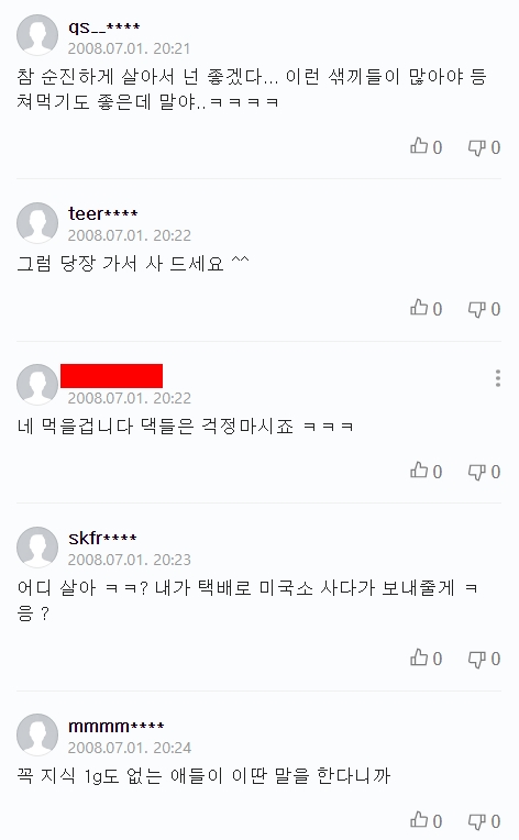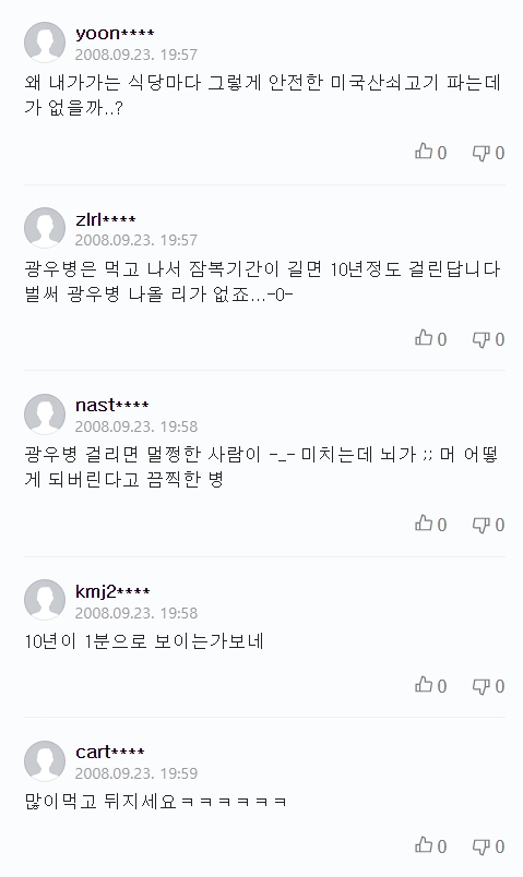 뭐 어쨌든.. 이제 와서 광우병에 대한 소문은 과장이었다는 것이 밝혀졌지만 당시에는 난리도 아녔죠. 아무리 해명을 해도 믿지 않았습니다. 이 댓글들만 봐도 당시 광우병에 대한 두려움이 어느 정도인지 대충 짐작할 수 있을 겁니다.
