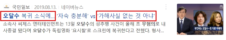 그리고 이런 사실관계가 불분명한 사건으로 인해, 그동안 오달수가 받은 물질적 · 정신적 피해는 어마어마했을 겁니다. 이미지 회복이 어려운 것은 덤이고요. 아마 아직도 배우 오달수가 무혐의라는 사실에 대해 모르는 사람들도 많을 거라 생각됩니다.