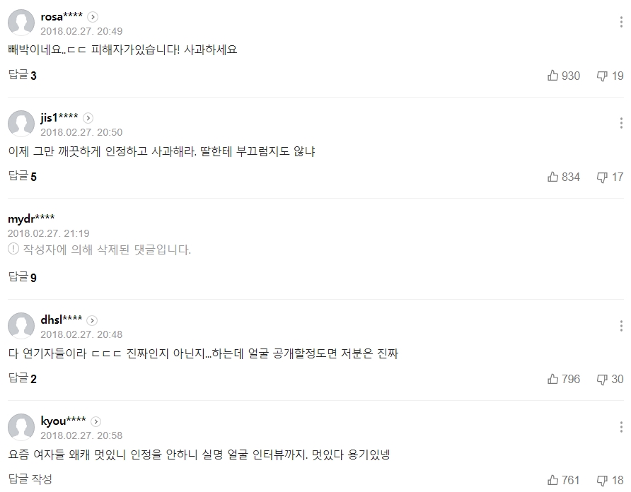 당시 뉴스에 달렸던 댓글 중 일부입니다. 거의 대부분의 댓글은 오달수를 욕했습니다. 당시에 진실이 밝혀지진 않았지만, 누구는 성폭행 폭로에 누구는 얼굴을 공개하면서 성추행 피해를 주장하니 진실이라고 믿어버린 거죠.