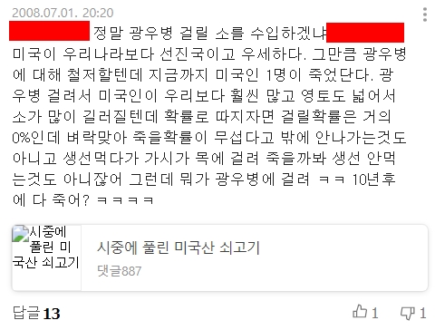 저는 그때 당시 중학생이었는데 다행히도 현명한 어머니 덕분에 선동되지 않았습니다. 그리고 저는 네이버 뉴스에 광우병은 과장됐다고 댓글을 달았다가 엄청 욕먹었던 증거도 있습니다.