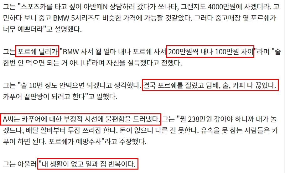 카푸어 삶을 위해 술, 담배, 커피를 끊고 투잡, 쓰리잡을 하면서 생활을 이어가고 있다는데... 뭐 좋습니다. 어차피 자동차를 안 샀으면 저렇게 열정적으로 돈을 아끼거나 투잡, 쓰리잡까지 안 했을 테니까요 또 이렇게 5년만 고생하면 돈은 다 갚을 테니까요.