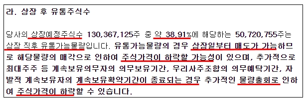 이런 위험요소는 투자를 함에 있어서 반드시 체크하고 넘어가야 할 사안이지만... 사실 개인 투자자들이 단기적으로 가장 많이 걱정하는 위험요소는 바로 대주주의 주식 매도로 인한 주가 하락일 겁니다. (보호예수, 의무보유 해제)