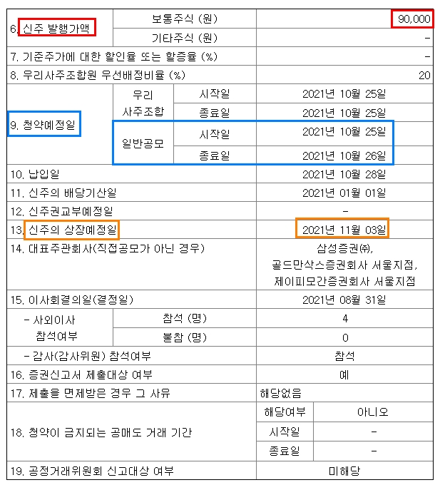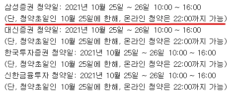 또한 청약 첫번째 날인 10월 25일에 한하여 모든 증권사에서 10:00 ~ 22:00까지 온라인으로 청약을 받는다고 하니, 아침에 출근하고 일하면서 정신없이 청약하지 말고 퇴근 후에 여유있게 청약해도 좋을 것 같습니다. 선착순으로 공모주를 우선 배정하는 것은 아니니까요.