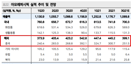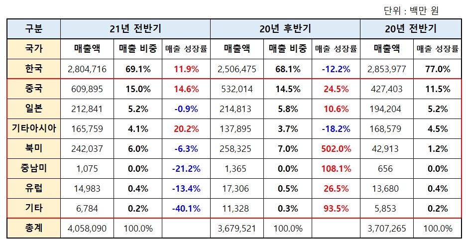 위 표는 LG 생활건강의 전체적인 매출 비중입니다. 21년 전반기 기준으로 보면, 한국이 70%이고 중국이 15% 정도임을 확인할 수있죠.