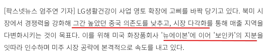 그래서 LG생활건강은 중국 의존도를 낮추기 위해 여러 기업들과 M&A를 하고 있습니다. 실제로 작년 초에 아시아 · 북미 공략을 위해 '피지오겔'을 인수하고 20년 후반기, 북미의 매출 비중이 급격히 증가했음을 확인할 수 있습니다.